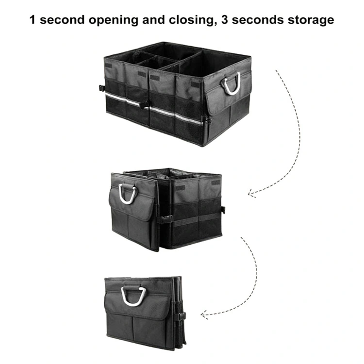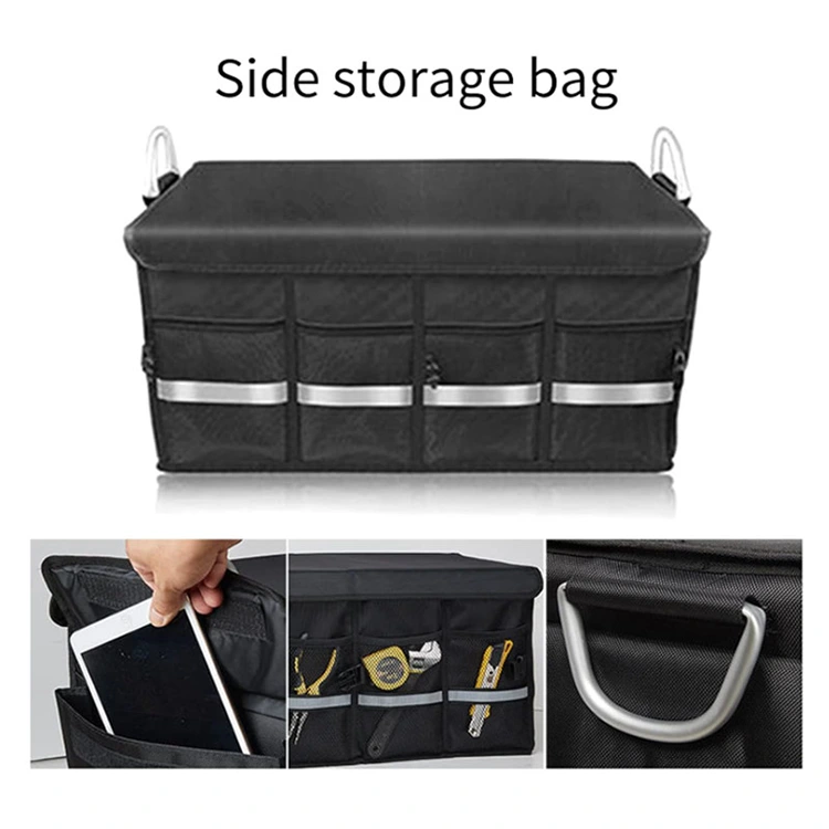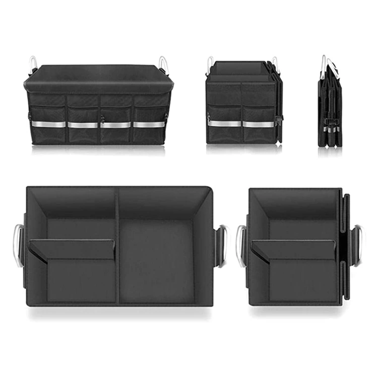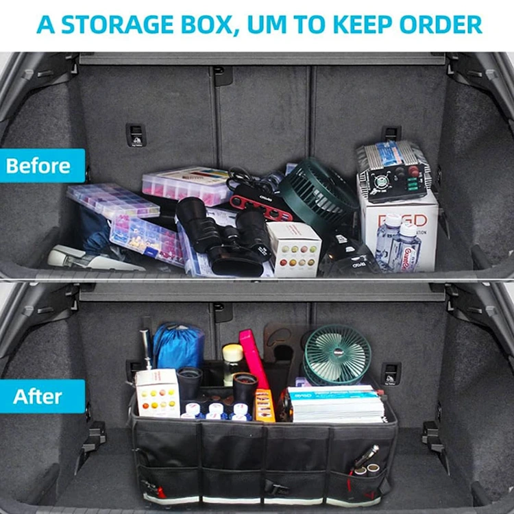 Tatlong pangunahing compartment ang nag -aayos ng mga tool, pagkain, sports gear, cleaner, at mga emergency item. Apat na mga bulsa sa gilid ng mesh ang may hawak na maliit na bagay tulad ng mga tuwalya o kard. Ang isang bulsa sa harap ay nagtitiyak ng mga logro at nagtatapos. Ito ay umaangkop sa mga trak, sedan, SUV, van, at medyo maraming sasakyan.