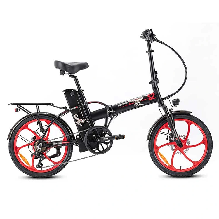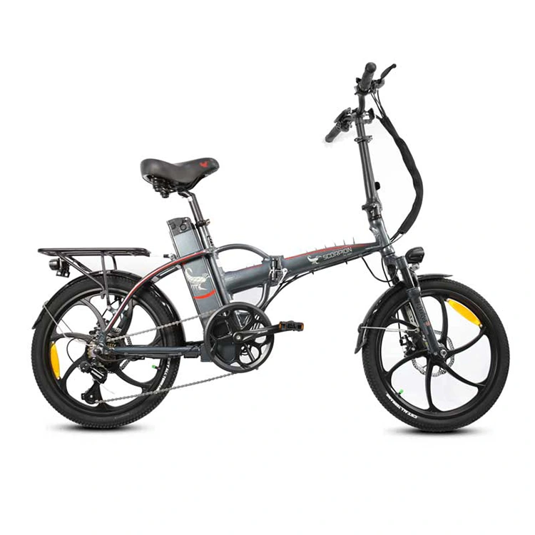 Elegant at malakas na disenyo ng gulong: Ang natitiklop na electric bike ay nagtatampok ng pula, limang nagsalita na mga gulong na haluang metal na may isang naka-bold na profile. Ang mga gulong na ito ay para sa parehong estilo at kapangyarihan, na nagtatampok ng isang maaasahang sistema ng disc preno para sa walang hirap at ligtas na pagganap ng pagpepreno.